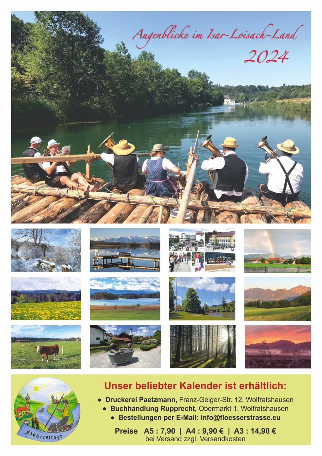 Heuer seit genau 10 Jahren geben wir unseren beliebten Kalender „Augenblicke im Isar-Loisach-Land“ heraus. Es gibt ihn wieder in 3 Größen und Preisen: klein (A5): 7,90 €, mittel (A4): 9,90 € und groß (A3): 14,90 €.