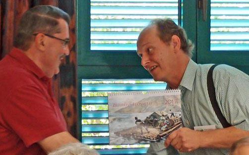 Bürgermeister Klaus Heilinglechner, Wolfratshausen, überreichte Hans-Walter Keweloh, Vorsitzender der Deutschen Flößerei-Vereinigung (Mitte), als Gastgeschenk wolfratshauserische Leckereien und der Flößerverein mit unserer Vorsitzender Gabriele Rüth einen Flößerkalender für 2017 (Bild) mit historischen Abbildungen.