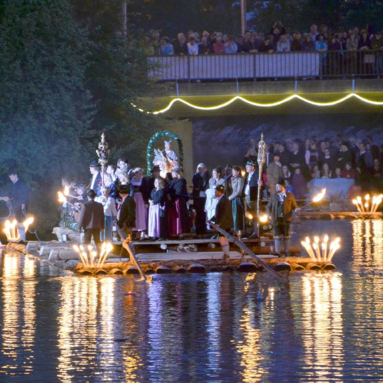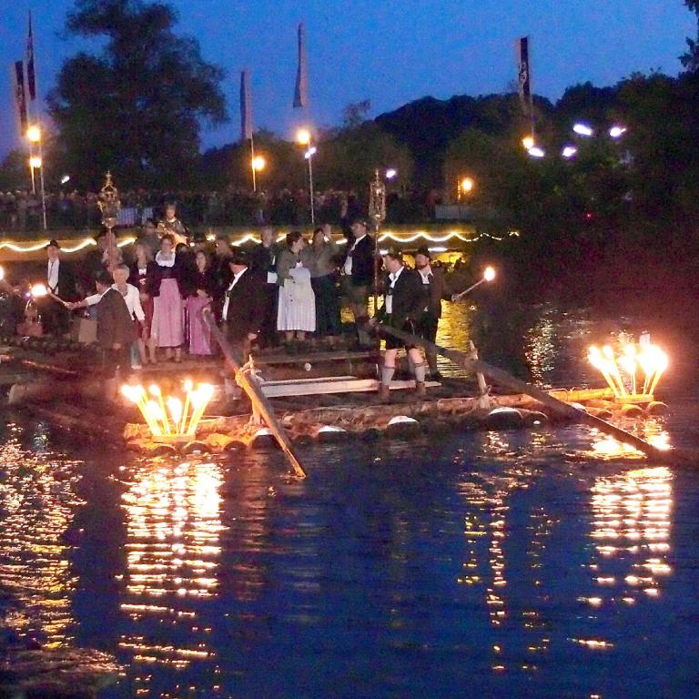 Ab Einbruch der Dunkelheit feierte die Stadt Wolfratshausen diese auf der Welt einmalige Flößertradition gemeinsam den ortsansässigen Flößereibetrieben, den Kirchen und den ortsansässigen Traditionsvereinen.Die Floßprozessionen wurden bis 1910 in Wolfratshausen regelmäßig durchgeführt. Wieder mit dabei unser Vizevorsitzender Hermann Paetzmann (3.v.links), der diesmal die Fackel hält.