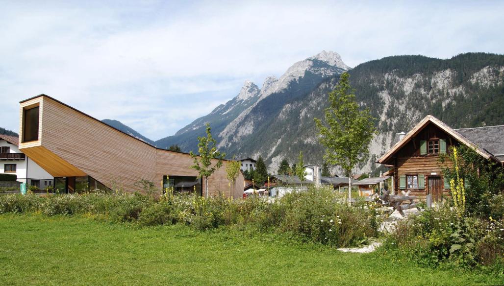 Der Außenbereich besticht durch seine bunte Vielfalt an heimischen Kräutern und Gehölzen, die von zahlreichen Schmetterlingen und anderen Insekten besucht werden und lädt zum Verweilen ein. Der einzigartige Spielplatz wurde gemeinsam mit den kindlichen Experten der Volksschule Scharnitz geplant und auch umgesetzt.